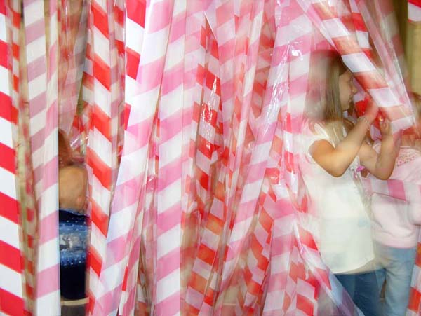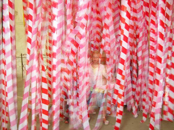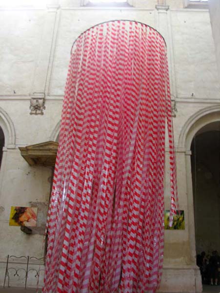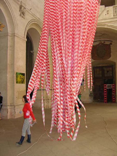 Material I used was also a quotation derived from that place: red and white striped warning tape was used all over the monastery complex that was being partially renovated. Another purpose to use that tape was a contrast that I needed to gain the proper effect: the opposition to the yellowish interior, an eye-catcher in that enormous space. |