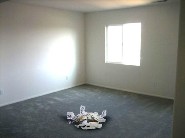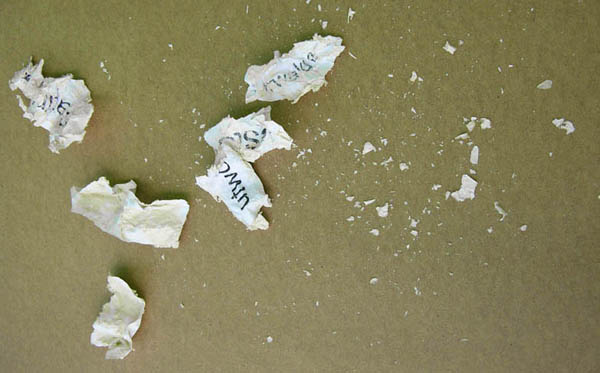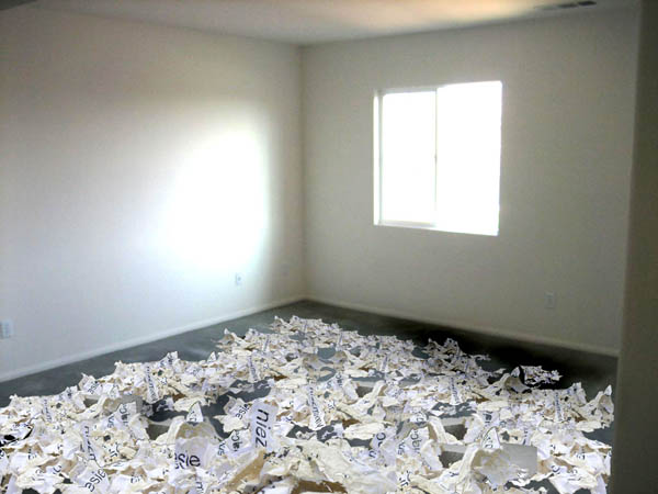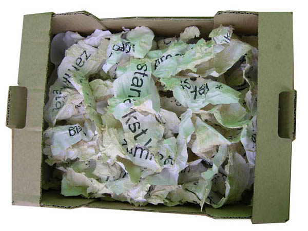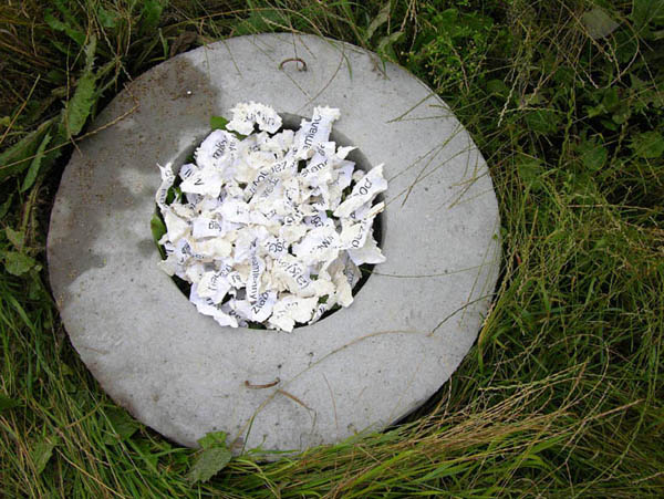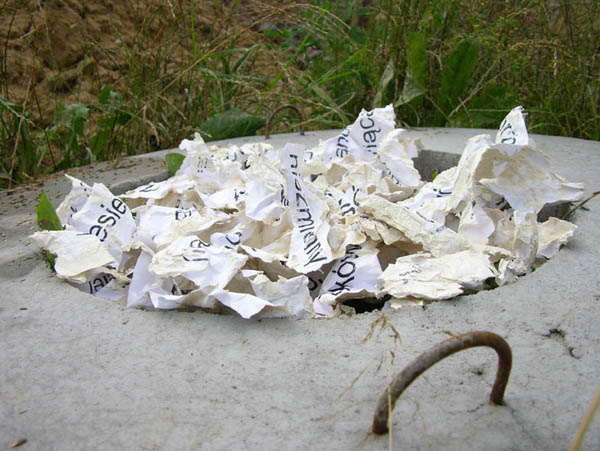 the pile of crumpled words should fill up some regularly shaped, heavy looking container like a circle of concrete to be the opposite to the fragility of the