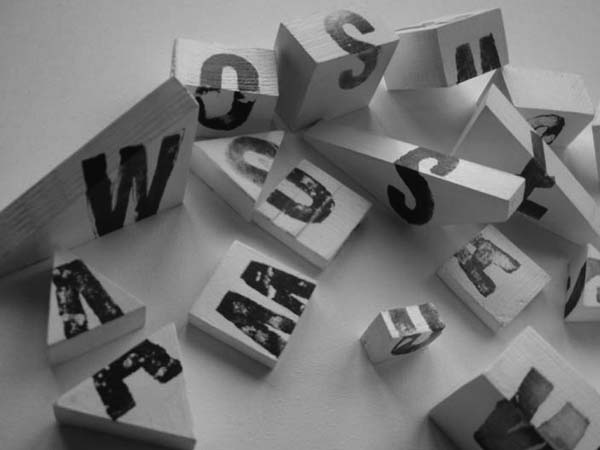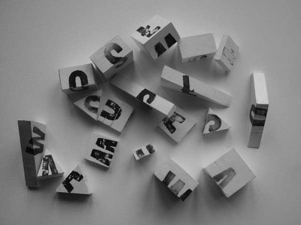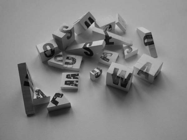 słowa, słowa – małe drewniane kostki, druk z szablonu 2009 words, words – small wodden cubes, stencil print 2009